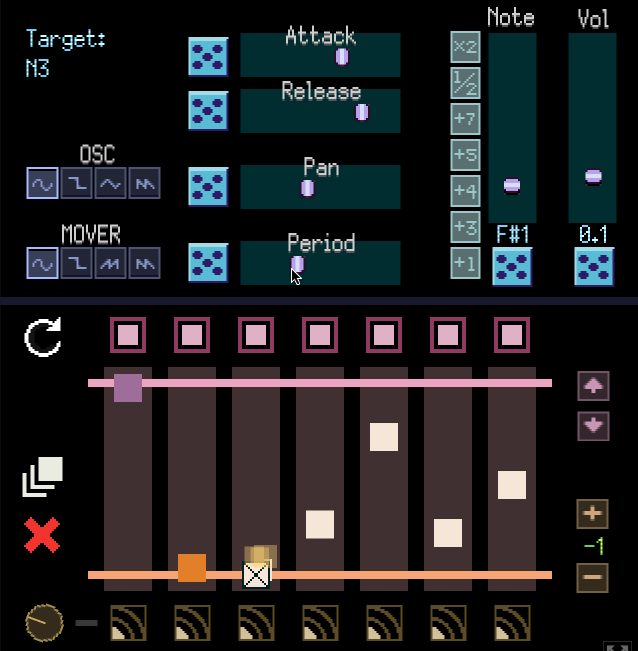 - The buttons to the left of the "Freq"/"Note" slider multiply each note by a music amount. *2 goes up and octave, 1/2 goes down an octave, +1 goes up one semitone, while +3 through +7 go up by major intervals.